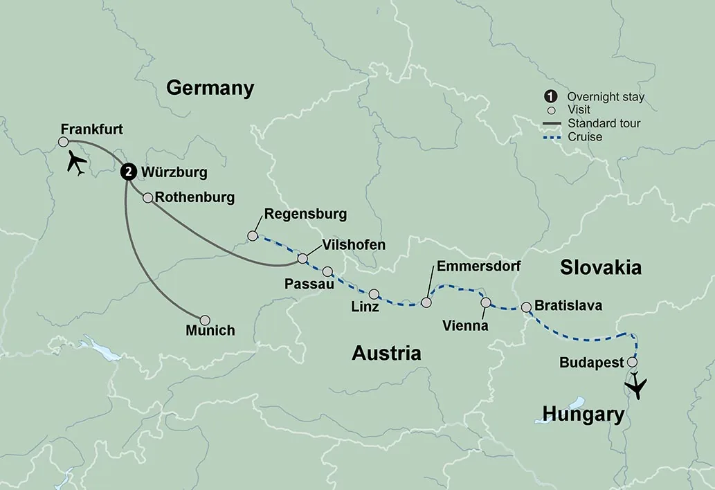 Enjoy two nights in lovely Würzburg, an ancient Franconian wine town rich in historic sites. Embark on a relaxing cruise along the scenic Danube River. Your lovely state-of-the-art craft offers a special treat – unlimited wine at every dinner. Pause as you go discovering the quaint villages and lively cities with local guides. Discover Vienna’s historic sites as you are immersed in the city’s atmosphere of opulence and elegance. Behold Munich’s many charms including its world-famous Glockenspiel. Spend time in Rothenberg’s quintessential Bavarian medieval old town where time has seemingly stood still. Drift along the river through the Wachau Valley dotted with castles and small riverside towns on a seven night cruise.